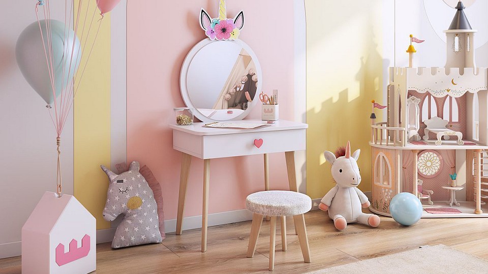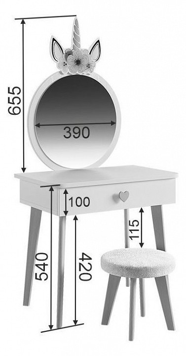 Набор детский единорожка: воплощение мечты каждой маленькой принцессы. Создайте волшебный уголок для вашей дочери с этим прекрасным набором. Трюмо с ярким зеркалом и выдвижным ящиком с ручкой в форме сердечка идеально подойдет для хранения всех любимых аксессуаров. Прочная столешница предлагает много пространства для рисования и других творческих занятий. Деревянные ножки со специальными фетровыми подпятниками гарантируют безопасность пола, а плюшевый чехол комфорт при сидении. Подарите радость и комфорт вашей принцессе с набором Единорожка — где качество встречается с мечтой.