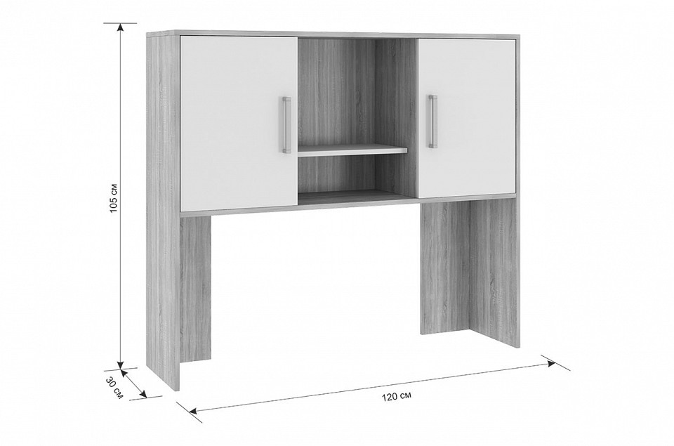 Компоненты, входящие в комплект: надстройка — 1200x300x1050 мм, стол письменный — 1200x600x750 мм, шкаф книжный — 400x403x1800 мм