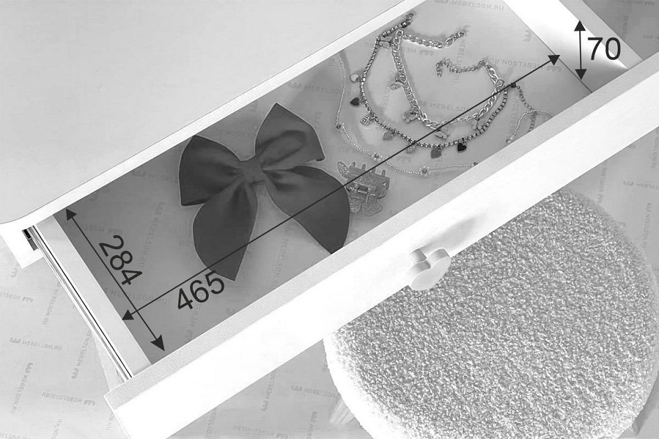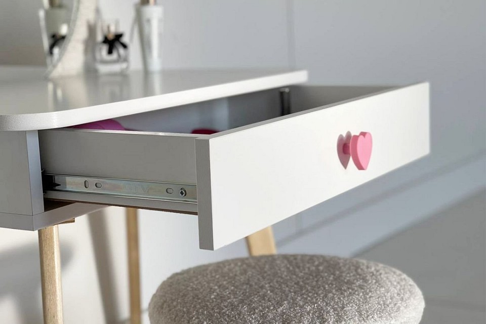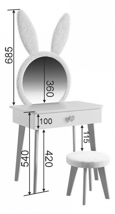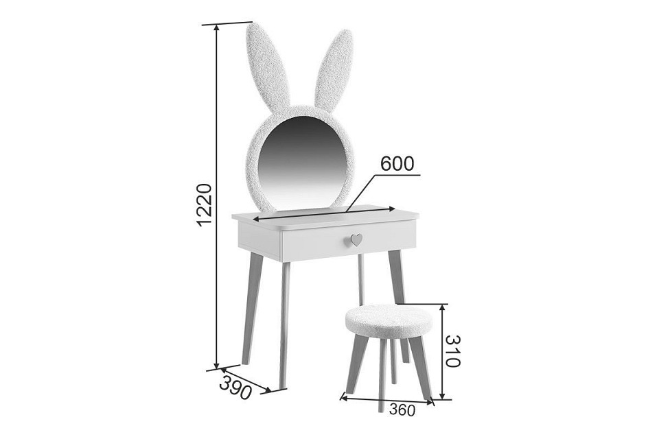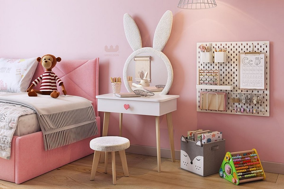 Детский набор Зайка: идеальное решение для маленькой принцессы. Этот набор непременно станет любимой мебелью для вашей дочери. Очаровательное зеркало украшено плюшевыми декоративными элементами, которые добавят в комнату тепла и уюта. Выдвижной ящик предоставляет просторное место для хранения детской косметики, украшений и многого другого. Прочные деревянные ножки трюмо и стульчика обеспечивают устойчивость и безопасность. Мягкий чехол на стульчике, создает комфорт при сидении. Дайте вашей дочери возможность чувствовать себя настоящей принцессой с набором Зайка. Наша мебель сочетает качество, дизайн и комфорт по доступной цене.