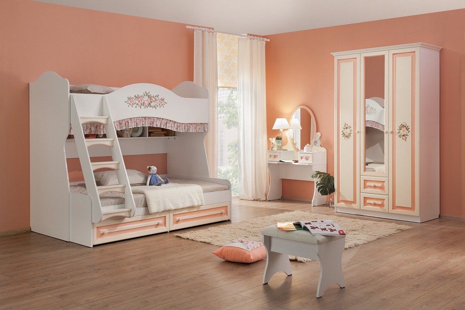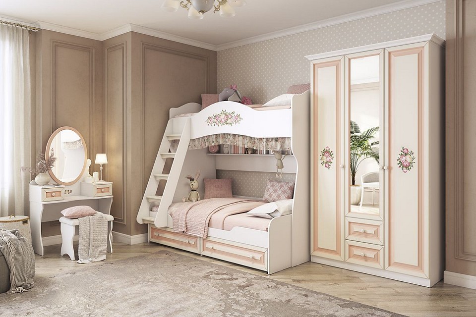Дополнительное описание: Кровать «Алиса» комплектуется вместительными выдвижными ящики для хранения, а также удобной безопасной лестницей, на ступенях которой антискользящее покрытие. Фасадные элементы модели украшены классической фрезеровкой с патиной и рисунком из роз.