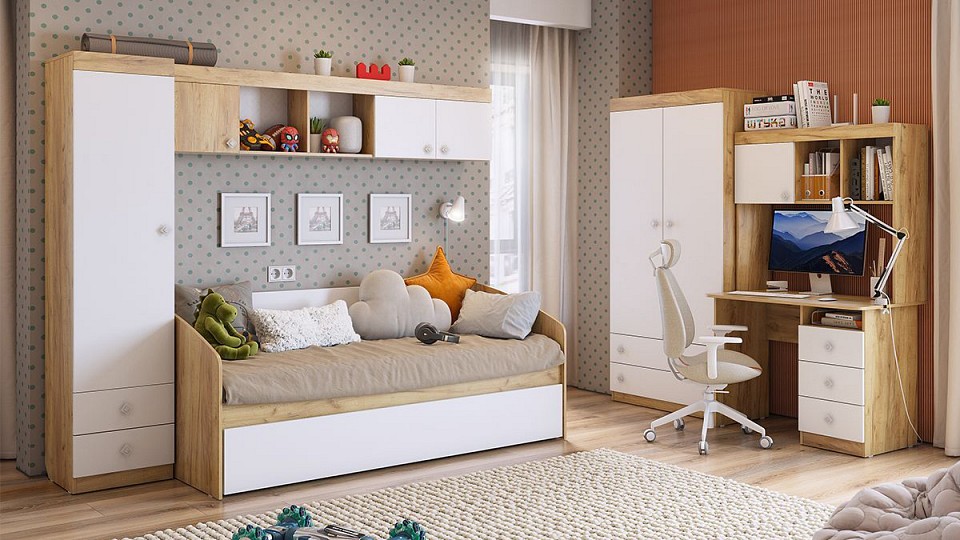 Дополнительное удобное спальное место или большой выдвижной ящик для хранения постельного белья и игрушек, на выбор, решать вам. Детская «Форсаж» — это стильная, современная детская, которая понравится каждому ребенку. Ограничитель для кровати — дополнительная опция. Покупается отдельно.