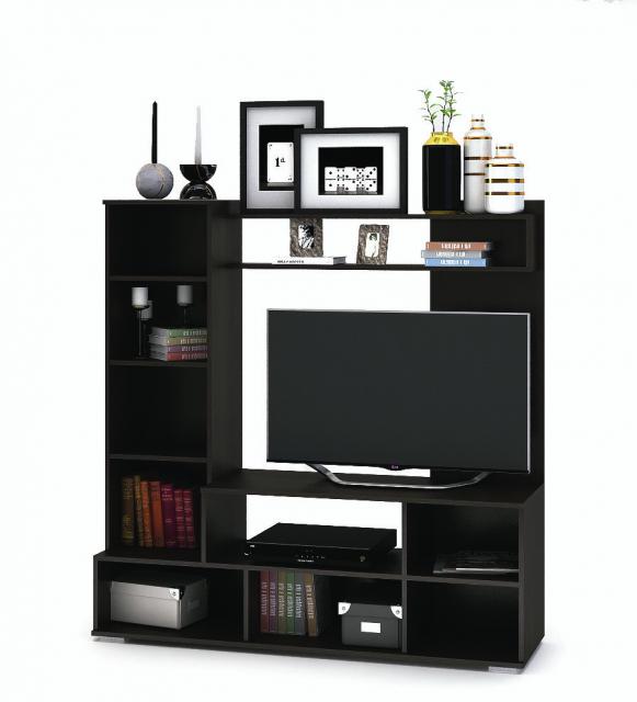 Строгий дизайн элементов стенки под ТВ позволяет создать ощущение не загруженного пространства, а контрастная расцветка придает всему гарнитуру выразительности.