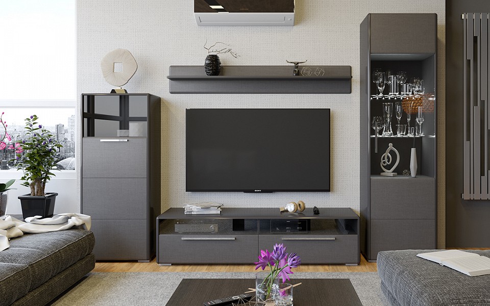 Компоненты, входящие в комплект: полка навесная — 1544x196x240 мм тумба — 544х340х1322 мм тумба под ТВ — 1544x440x382 мм шкаф-витрина — 544x340x1944 мм