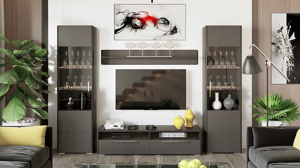 Компоненты, входящие в комплект: тумба под ТВ — 1544x440x382 мм полка навесная — 1544x196x240 мм 2 шкафа-витрины — 544x340x1944 мм