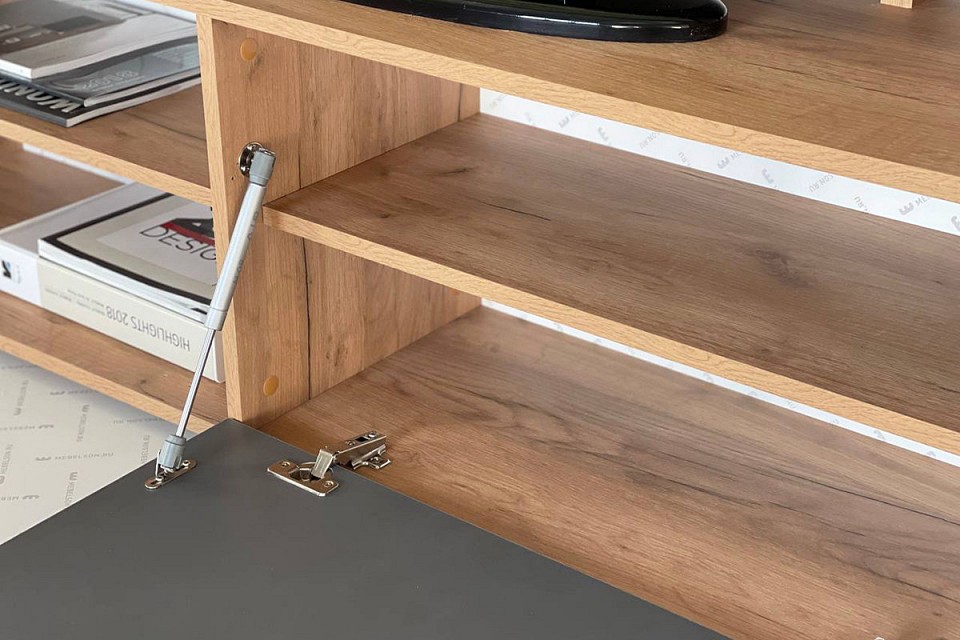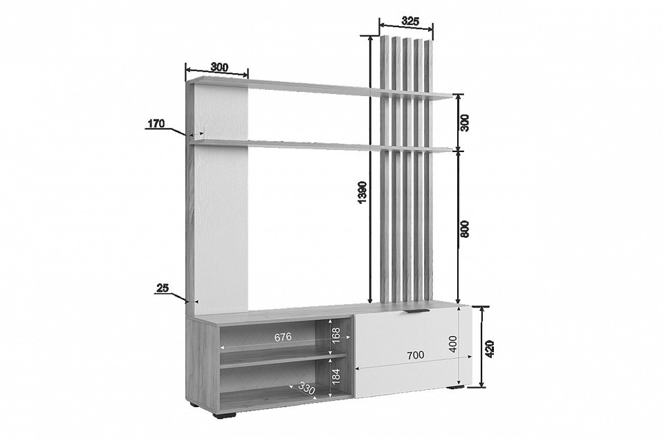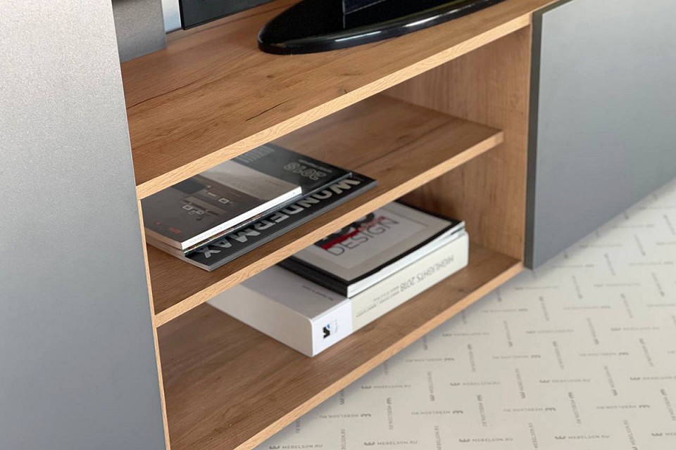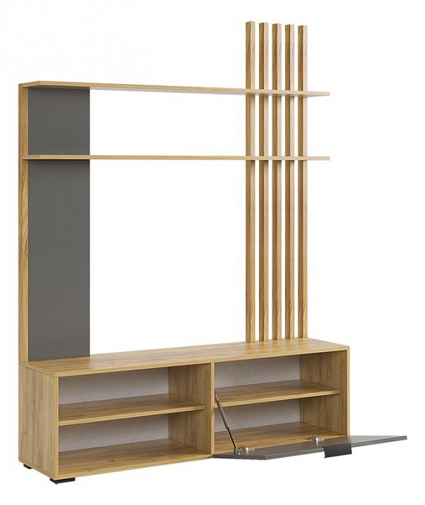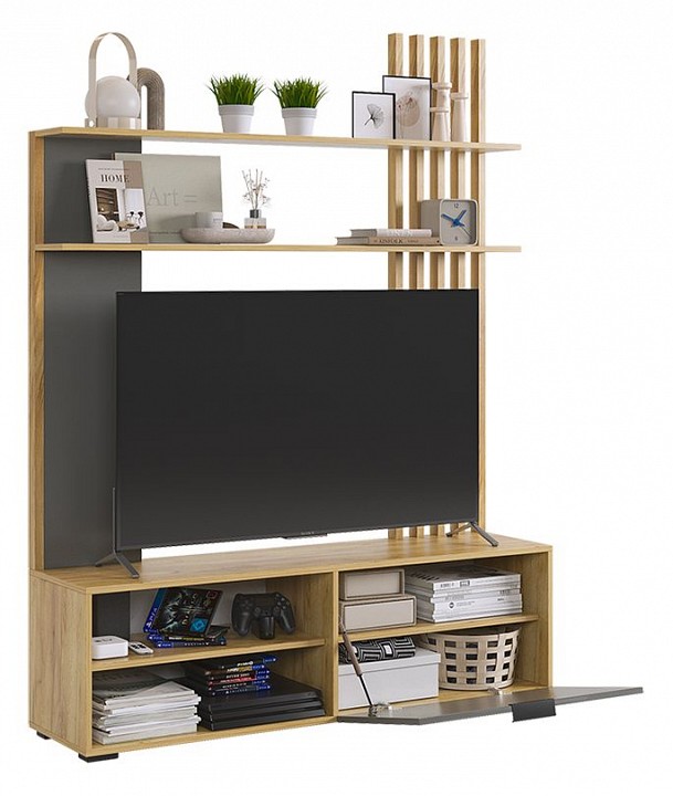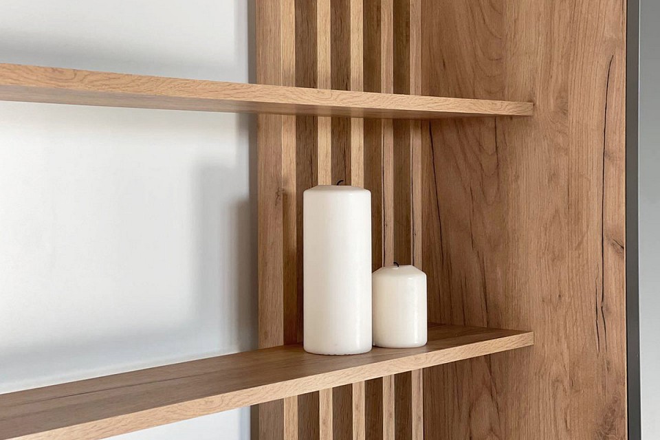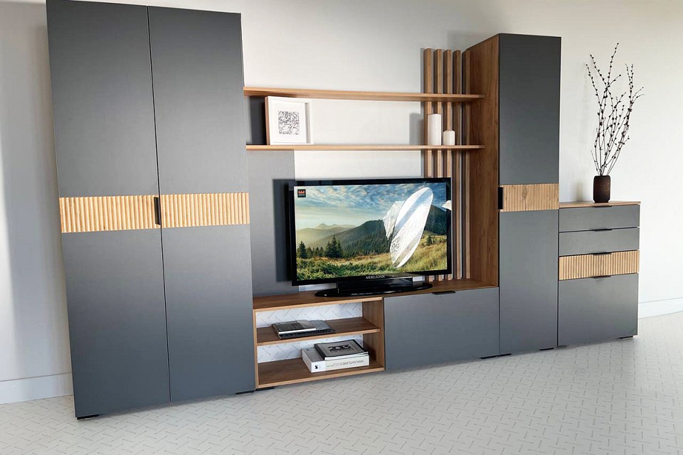 Модное решение — гостиная ‘Бери’. Ее основное преимущество- небольшая глубина (350 мм), но несмотря на это, в ней поместятся много полезных и ценных вещей. Гостиная ‘Бери’- это закрытые и открытые секции, место для ТВ с диагональю до 55 дюймов и декоративными полками для ценных и важных мелочей. Фишка гостиной, трендовые рейки из МДФ профиля будут стильным акцентом в вашей комнате. Сборка универсальная. Гостиная отлично сочетается со всеми модулями ‘Бери’.