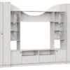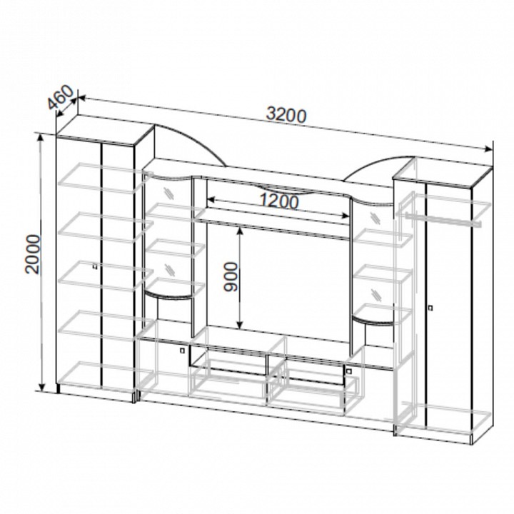 Дополнительные параметры: направляющие ящиков — роликовые, петли — без доводчиков, стеклостворки — гнутое прозрачное стекло с пескоструйным орнаментом, для безударного закрывания распашных створок их можно укомплектовать накладными демпферами, для полного комплекта понадобится 6 демпферов, ниша под ТВ 1200×900 мм позволит установить телевизор с диагональю до 46 дюймов,