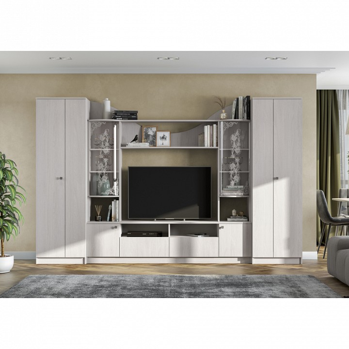 Элегантная модель для просторных гостиных. Светлое цветовое решение в сочетании с декоративными стеклами.