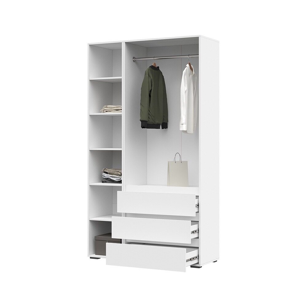 Особенностью модели является пенальная секция с пятью полками и большой платяной отдел для штанги и три выдвижных ящика.