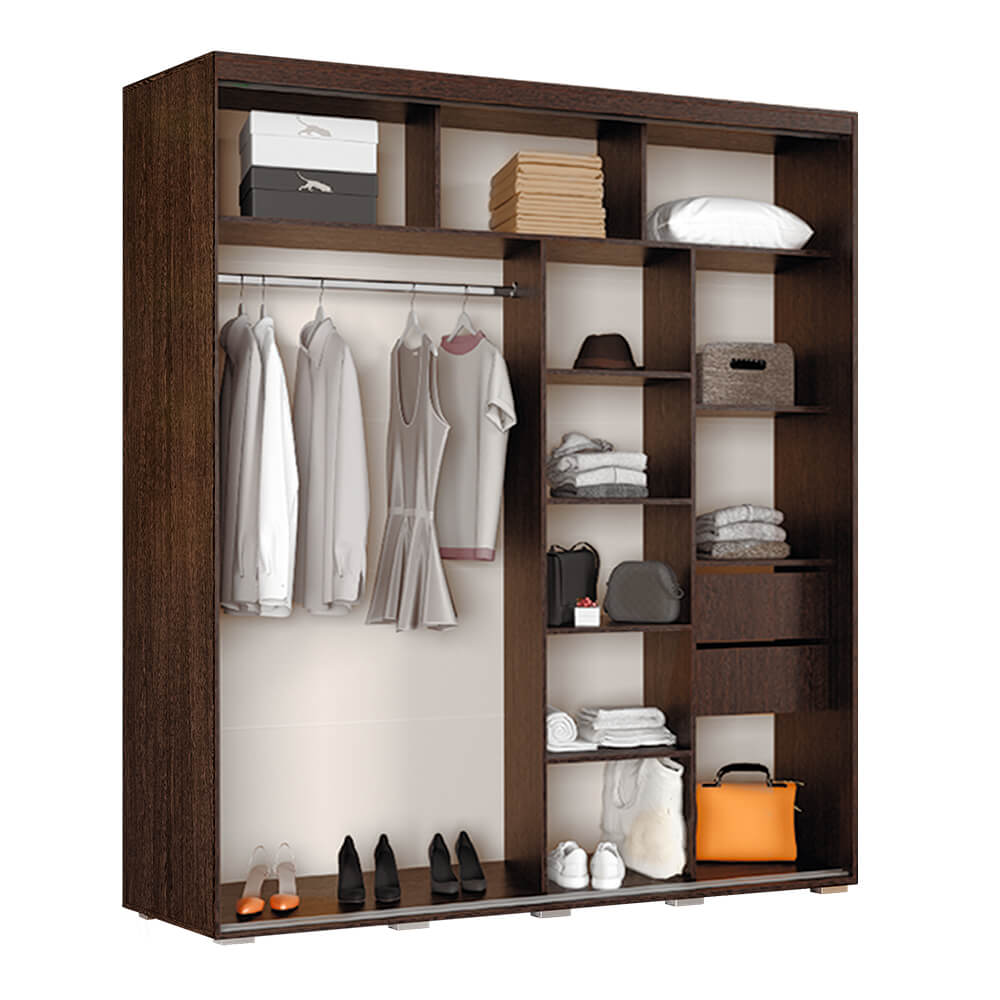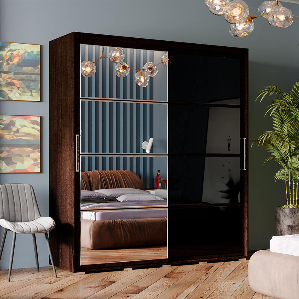 Модель изготовлена из ЛДСП, одна раздвижная створка выполнена из темного стекла, а вторая – зеркальная, такой прием облегчает конструкцию и позволяет расширить пространство, внутри модель состоит из многочисленных полок и ящиков для белья и одежды, а также отделения со штангой для плечиков.