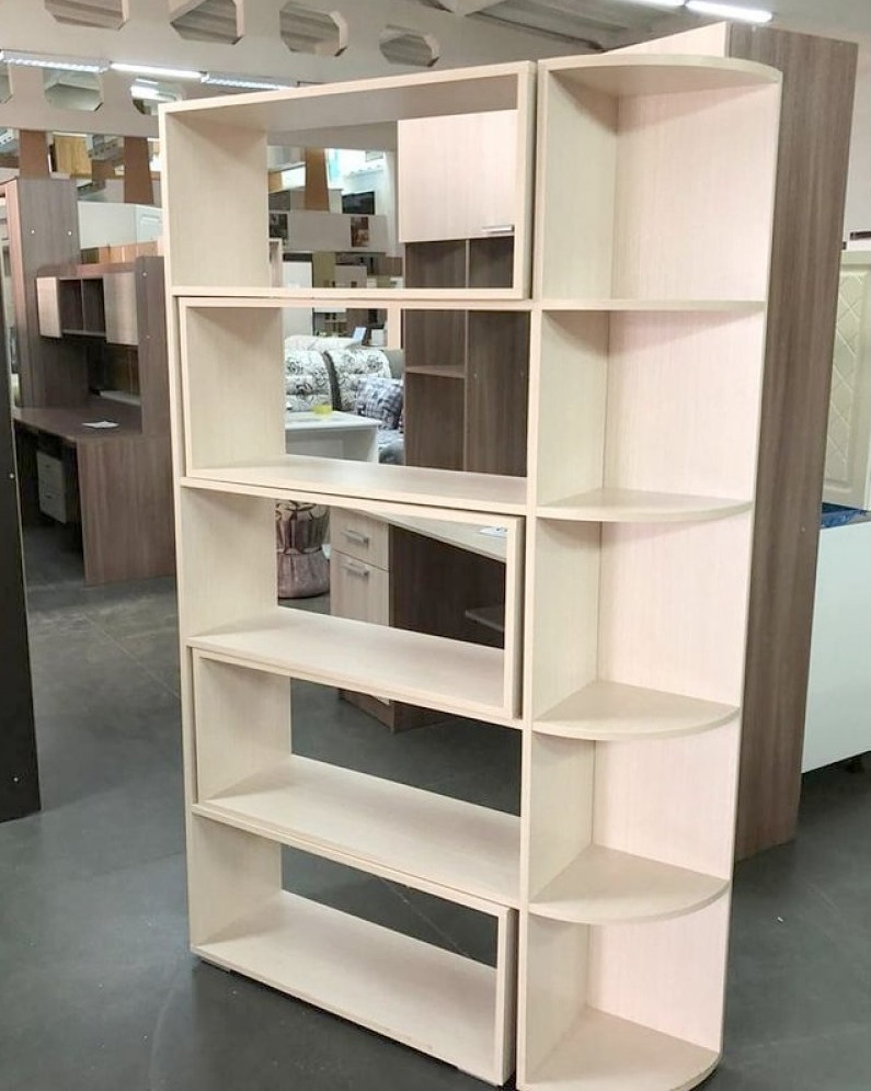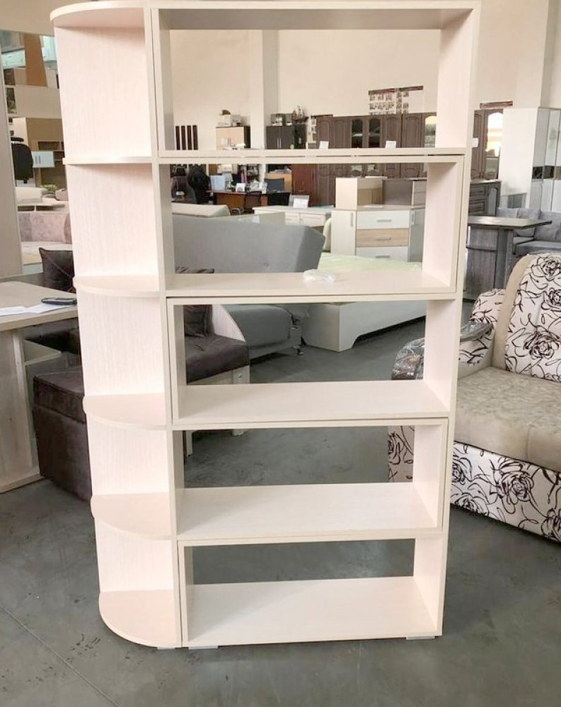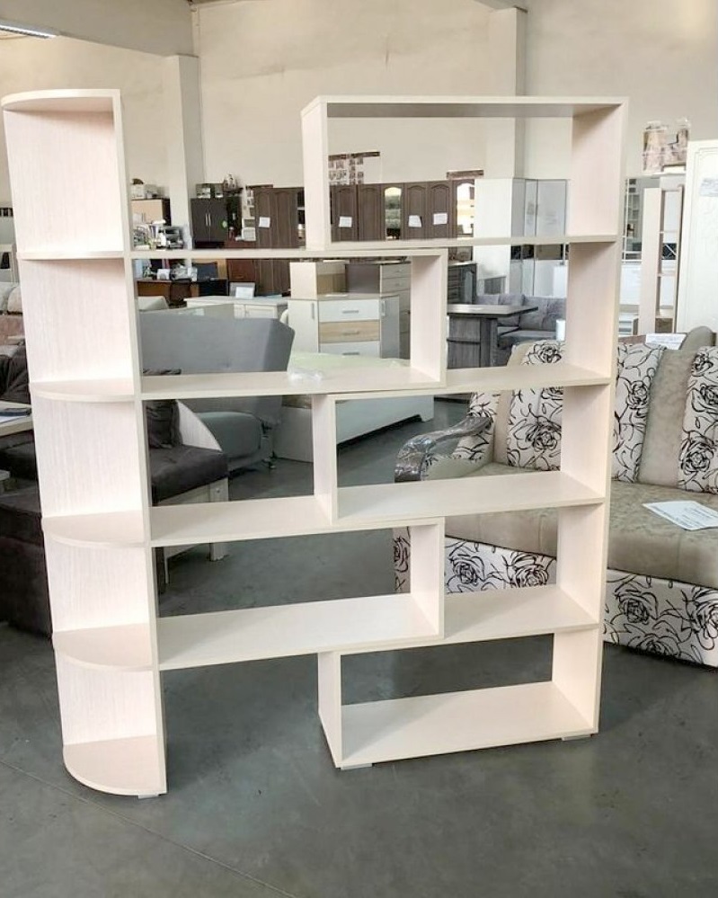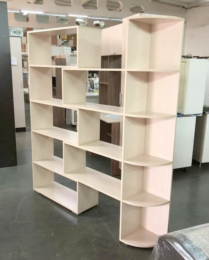 Стеллаж №4 — оригинальная мебель, состоящая из комбинации открытых полок, глубоких ниш и углового стеллажа с закругленными полочками. Книги, подсвечники, красивая посуда, рамки с фотографиями, горшочки с живыми растениями, оригинально расположенные на полках и в нишах придадут интерьеру неповторимый лоск и изящество.