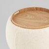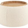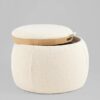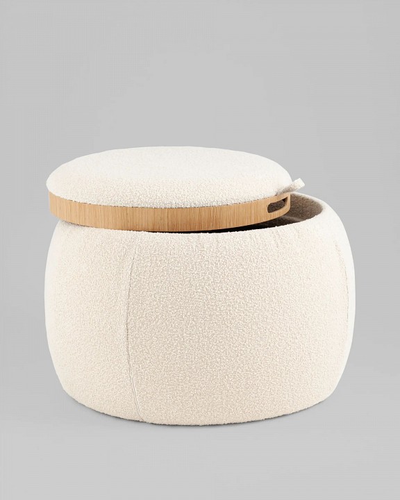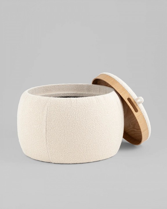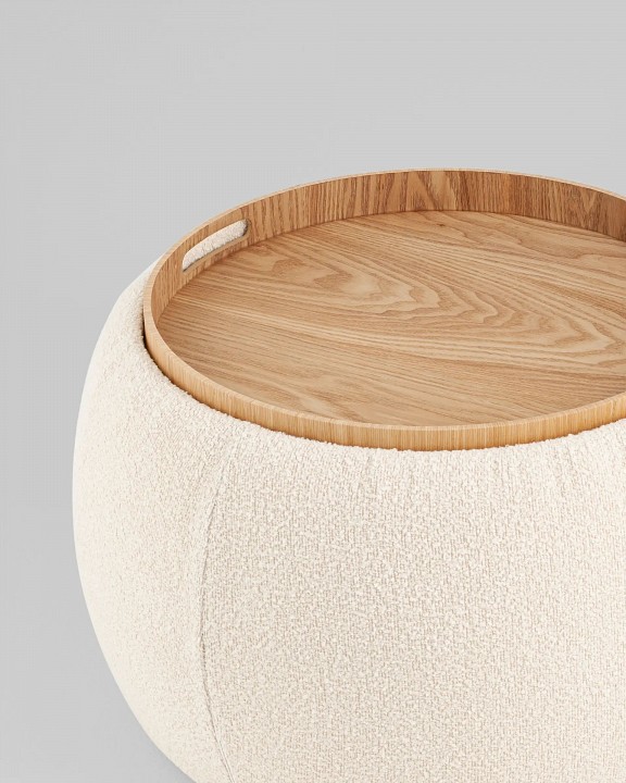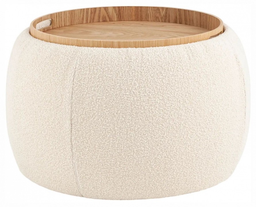 Мягкий пуф с ящиком станет незаменимым украшением интерьера. Он не только удобный, но и функциональный. Благодаря двухсторонней крышке, пуф можно трансформировать в журнальный столик. Столешница выполнена из светлого дерева с бортиками по краям и вырезными ручками для удобства, и безопасности при использовании. Крышка пуфика полностью съемная и при необходимости ее можно использовать как поднос. Компактный и вместительный, такой пуфик наполнит пространство особым уютом и теплом. Подойдет для любого интерьера — как в классическом стиле, так и в современном. Мягкая обивка выполнена из букле в бежевом цвете. Прочный каркас из фанеры не утяжеляет изделие и выдерживает нагрузку до 150 кг. Небольшие подпятники в основании пуфа защищают напольные покрытия от царапин и предотвращают скольжение.