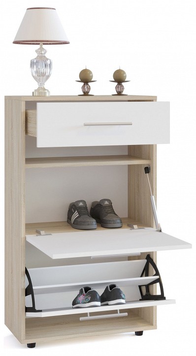Вместительная тумба для обуви шириной 600 мм ТП-2. Верхний выдвижной ящик вместит всё, что нужно взять с собой, выходя из дома. Средняя дверь оснащена откидывающимся механизмом со специальными полками для размещения обуви, который обеспечивает удобство хранения и легкий доступ к необходимой паре кроссовок или туфель. За нижней дверью также располагается отсек для хранения обуви. Изделие поставляется в разобранном виде. Хорошо упаковано в гофротару вместе с необходимой фурнитурой для сборки и подробной инструкцией. Обратите внимание!Для максимальной устойчивости конструкции модель необходимо прикрепить к стене. В начале эксплуатации ящика направляющие имеют тугой ход, в процессе пользования открывание будет осуществляться легко, плавно и бесшумно. Рекомендуем сохранить инструкцию по сборке (паспорт изделия) до истечения гарантийного срока.
