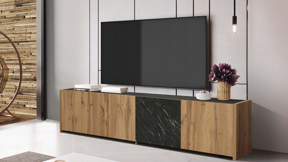 Дополнительное описание: Тумба под ТВ 56.01 ‘Адажио’ с 3-мя распашными дверями и полками за ними.