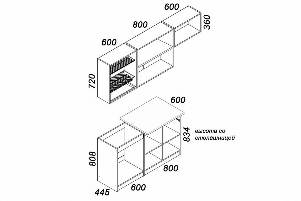 Примечание: В комплект входит: тумба напольная под мойку: 600x808x445 мм тумба напольная с ящиком: 800x808x445 мм шкаф-сушка навесной: 600х720×285 мм шкаф навесной: 800x720x285 мм шкаф навесной: 600x360x285 мм столешница: 800x26x600 мм. Рекомендуется установка накладной мойки шириной 600 мм (в комплект не входит).
