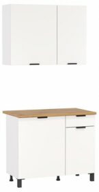 Комплект 1 Кухня ‘Венера’ (1000) (верх) — двухсекционный, распашной навесной шкаф для кухни. Широкая секция 600мм и узкая секция шириной 400мм. Внутри каждая секция разделена полкой. + Кухня ‘Венера’ (1000) (низ) — двухсекционный, распашной рабочий стол для кухни. Широкая секция 600мм под духовой шкаф или кухонную утварь. Узкая секция 400мм оборудована выдвижным ящиком на шариковых направляющих без доводчиков, внутри секция разделена полкой. Корпус: ЛДСП. Фасад: ЛДСП. Столешница: Постформинг 26мм. Ручки: металл. Петли: с доводчиком. Опоры: пластиковые высотой 100мм. Сборка изделия универсальная на правую и левую стороны.