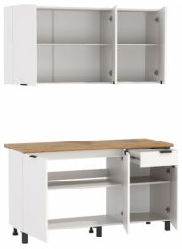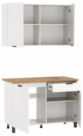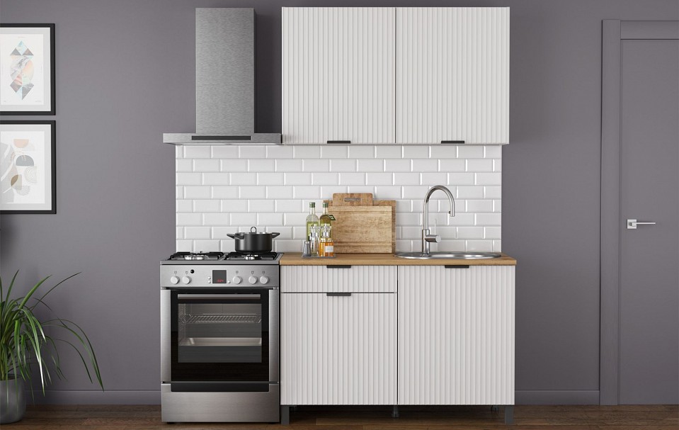 Примечание: В комплект входит: стол-тумба — 1200х600х850, стол-тумба — 1500х600х850, тумба навесная — 1200х320х720, тумба навесная — 1500х300х720. В комплект не входит: мойка смеситель стеновая панель (фартук) бытовая техника.