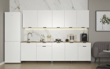 Комплект 13 Кухня ‘Венера’ (1200) (верх) — двухсекционный, распашной навесной шкаф для кухни. Две секции шириной по 600мм. Внутри каждая секция разделена полкой. + Кухня ‘Венера’ (1200) (низ) — двухсекционный, распашной рабочий стол для кухни. Две секции шириной по 600мм. Одна секция оборудована выдвижным ящиком на шариковых направляющих без доводчиков, внутри каждая секция разделена полкой. +Кухня ‘Венера’ (1500) (верх) — двухсекционный, распашной навесной шкаф для кухни. Широкая секция 1000мм с двумя дверцами и узкая секция шириной 500мм с одной дверцей. Внутри каждая секция разделена полкой. +Кухня ‘Венера’ (1500) (низ) — двухсекционный, распашной рабочий стол для кухни. Широкая секция 1000мм с двумя дверцами и узкая секция шириной 500мм с одной дверцей. Внутри каждая секция разделена полкой. Узкая секция дополнительно оборудована выдвижным ящиком на шариковых направляющих без доводчиков. Корпус: ЛДСП. Фасад: МДФ с ПВХ (фрезерованный)+ МДФ с ПВХ. Столешница: Постформинг 26мм. Ручки: металл. Петли: с доводчиком. Опоры: пластиковые высотой 100мм. Сборка изделия универсальная на правую и левую стороны.