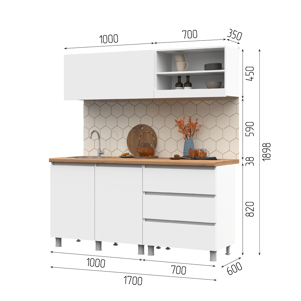 Ширина 1700 мм Глубина 600 мм Высота 1898 мм Материал: ЛДСП Цвет корпуса: Белый Цвет фасадов верх: Белый шагрень Цвет фасадов низ: Белый шагрень Столешница ДСП 38 мм., покрытая слоистым пластиком в цвете «Дуб вотан». Комплектация: Верх: — Шкаф 1000×450х350мм — Шкаф 700×450х350мм Низ (с учетом высоты опор и столешницы): — Стол 1000×858х600мм — Стол с ящиками 700×858х600мм — Столешница 1,0м и 0,7м Габаритный размеры нижних модулей ШхВхГ мм: 1700х858х600 мм. (С учетом высоты опор и столешницы). Габаритные размеры верхних модулей ШхВхГ мм: 1700х450х350 мм. Задняя стенка ЛДВП Белый. Регулируемые опоры 100 мм. Четырехшарнирные петли. Тип направляющих шариковые Вес 91.09 кг Кухня «Хелен» обладая компактными габаритами, гармонично впишется в кухню любого размера. Она выполнена в скандинавском стиле с ровными фасадами без ручек, в сочетании теплых оттенков золотого дерева и белоснежных панелей. Фасад обладает приятной на ощупь, шелковистой фактурой поверхности, которая не сохраняет отпечатков после касания. Каждый из модулей кухни Хелен обладает уникальным конструктивом и предлагает продуманный функционал, эргономично организовывая рабочее пространство, предоставляя достаточно места для хранения и размещения всех необходимых вещей, посуды и бытовой техники — Распашной нижний модуль шириной 1000 мм. разделен перегородкой на две части, имеет место под мойку и вместительную секцию с полкой для крупной посуды или кухонной техники. — Нижний модуль шириной 700 мм. содержит три выдвижных ящика, бесшумно выдвигающихся на шариковых направляющих полного выдвижения и отлично подойдет для хранения столовых приборов и других небольших принадлежностей. Верхние модули предлагают открытые ниши и закрытые секции. — Модуль шириной 1000 мм. открывается с помощью газлифтов захватом снизу и разделен на две секции с местом для сушки и секцией с полкой — Нижняя полка открытого модуля шириной 700 мм. имеет декоративную горизонтальную планку. В комплект не входят: бытовая техника, мойка, посудосушитель, смеситель и стеновая панель. Они приобретаются отдельно.