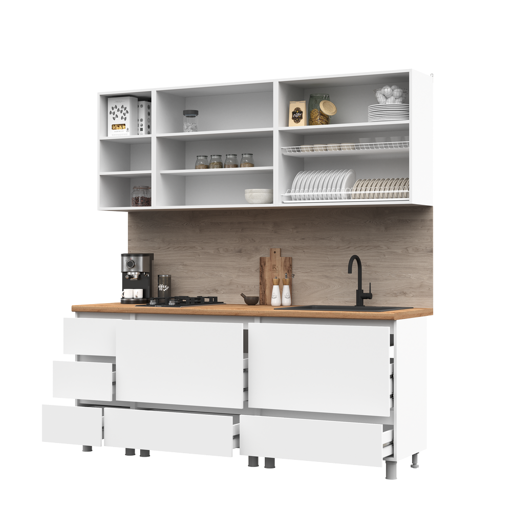 В комплект не входят: бытовая техника, мойка, посудосушитель, смеситель и стеновая панель. Они приобретаются отдельно.