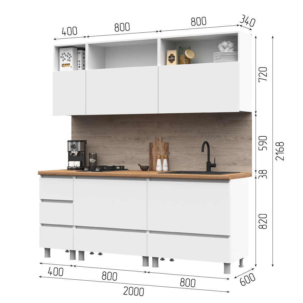 Габаритный размеры нижних модулей ШхГхВ мм: 2000х600х858мм (с учетом высоты опор и столешницы)