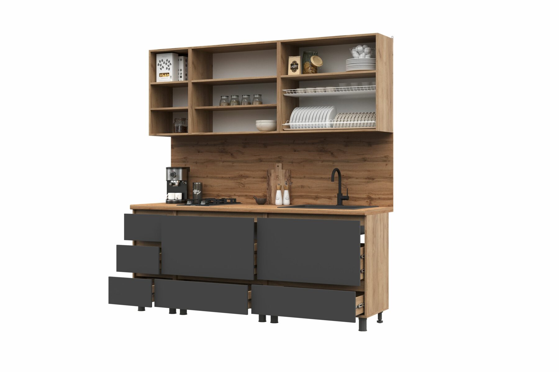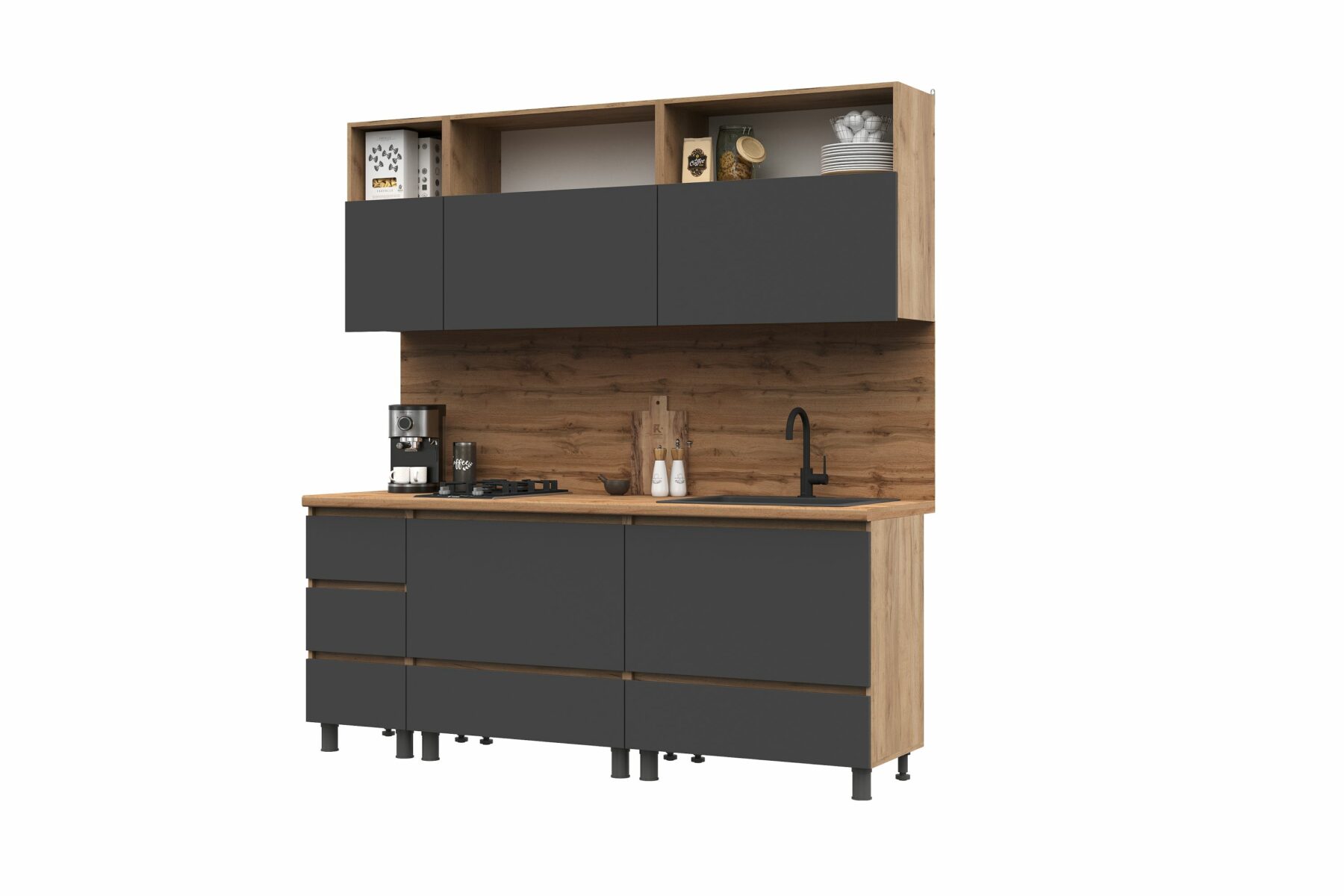 — Модули шириной 800 мм. открываются с помощью газлифтов захватом пальцами снизу. Один из них разделен полкой на две секции, например, под продукты, а другой — с местом для сушки.