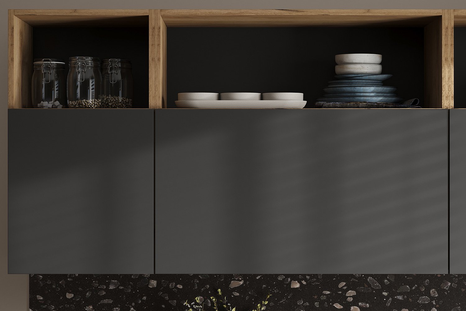 Верхние модули представляют собой комбинированную систему хранения с возможностью выбора места установки открытых полок — на верхнем уровне или внизу.