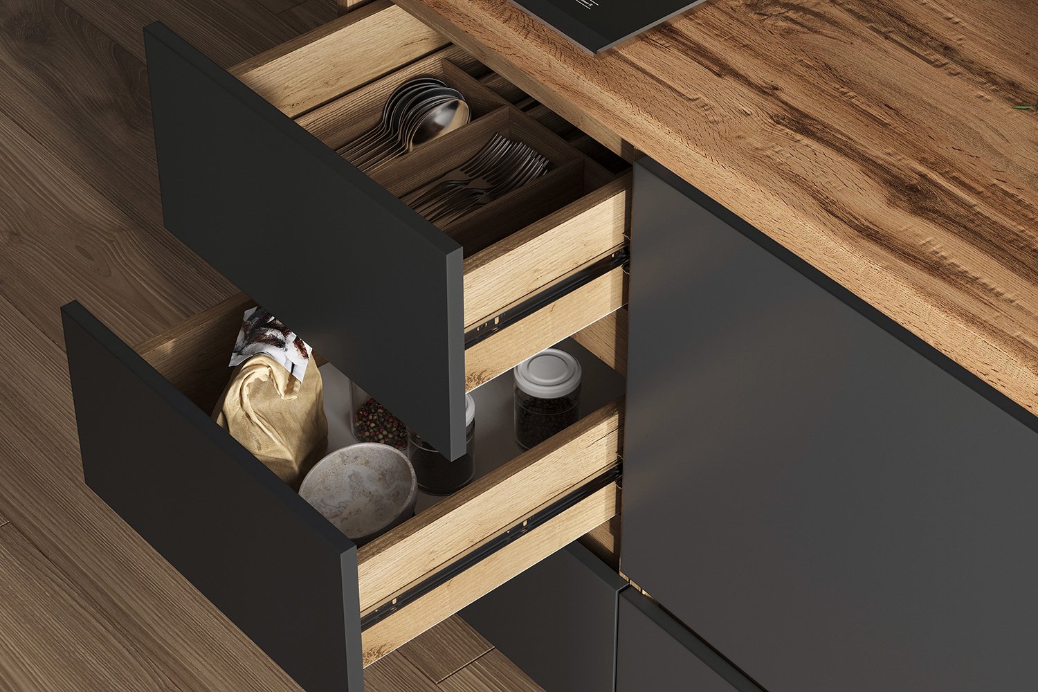 — Нижний модуль шириной 400 мм. содержит три выдвижных ящика, бесшумно выдвигающихся на шариковых направляющих полного выдвижения и отлично подойдет для хранения столовых приборов и других небольших принадлежностей.