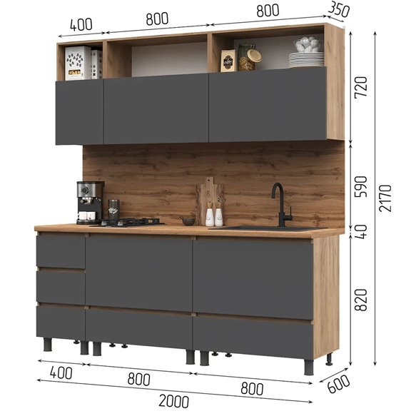 Габаритный размеры нижних модулей ШхГхВ мм: 2000х600х858мм (с учетом высоты опор и столешницы)
