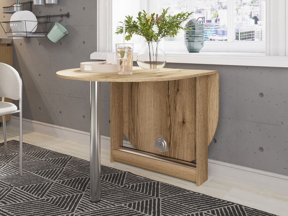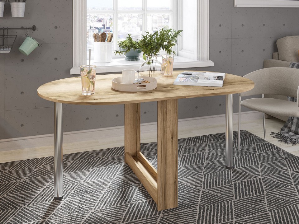 Небольшой овальный стол-книжка с откидной столешницей. Модель будет удобным элементом на небольшой кухне в квартире или в дачном домике. Отсутствие углов у столешницы снижает травмоопасность. При необходимости размеры столешницы можно увеличить, подняв крыло и прикрутив к нему ножку. В сложенном состоянии ножка хранится в специальной нише в основании стола. Ширина столешницы в разложенном состоянии — 1548 мм, в сложенном — 860 мм. Обратите внимание! Стол складывается только на половину. То есть вы не сможете сложить его в узкую тумбу и спрятать. Рекомендуем сохранить инструкцию по сборке (паспорт изделия) до истечения гарантийного срока.