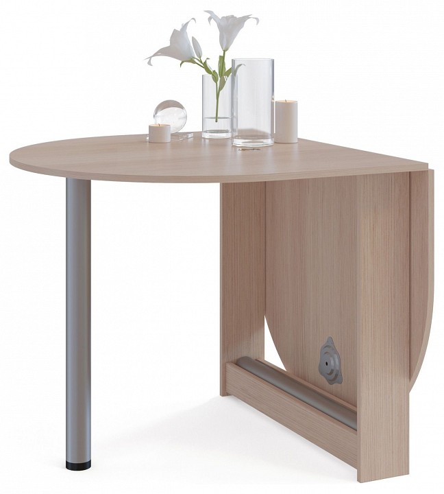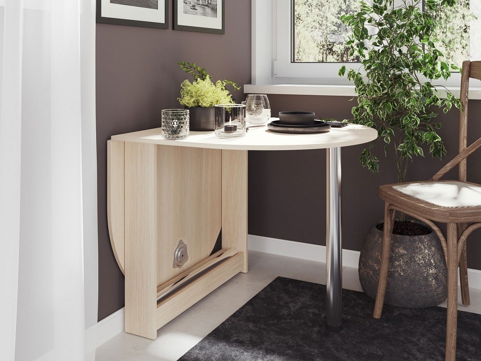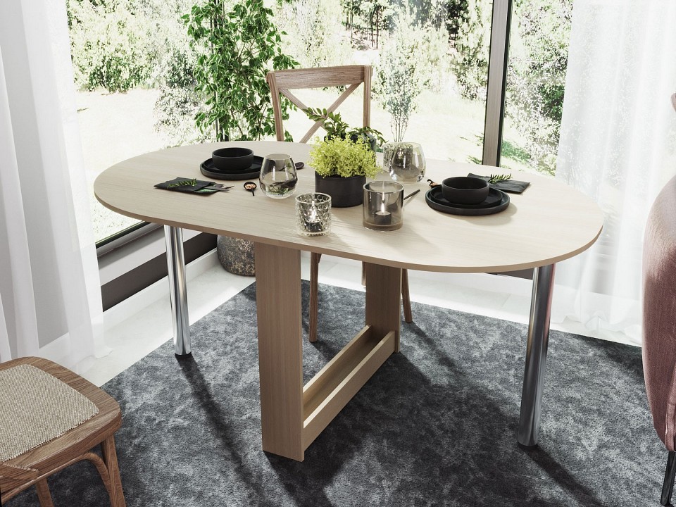 Небольшой овальный стол-книжка с откидной столешницей. Модель будет удобным элементом на небольшой кухне в квартире или в дачном домике. Отсутствие углов у столешницы снижает травмоопасность. При необходимости размеры столешницы можно увеличить, подняв крыло и прикрутив к нему ножку. В сложенном состоянии ножка хранится в специальной нише в основании стола. Ширина столешницы в разложенном состоянии — 1548 мм, в сложенном — 860 мм. Обратите внимание! Стол складывается только на половину. То есть вы не сможете сложить его в узкую тумбу и спрятать. Рекомендуем сохранить инструкцию по сборке (паспорт изделия) до истечения гарантийного срока.