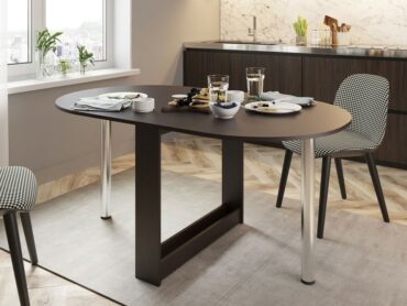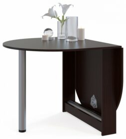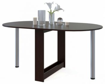 Небольшой овальный стол-книжка с откидной столешницей. Модель будет удобным элементом на небольшой кухне в квартире или в дачном домике. Отсутствие углов у столешницы снижает травмоопасность. При необходимости размеры столешницы можно увеличить, подняв крыло и прикрутив к нему ножку. В сложенном состоянии ножка хранится в специальной нише в основании стола. Ширина столешницы в разложенном состоянии — 1548 мм, в сложенном — 860 мм. Обратите внимание! Стол складывается только на половину. То есть вы не сможете сложить его в узкую тумбу и спрятать. Рекомендуем сохранить инструкцию по сборке (паспорт изделия) до истечения гарантийного срока.