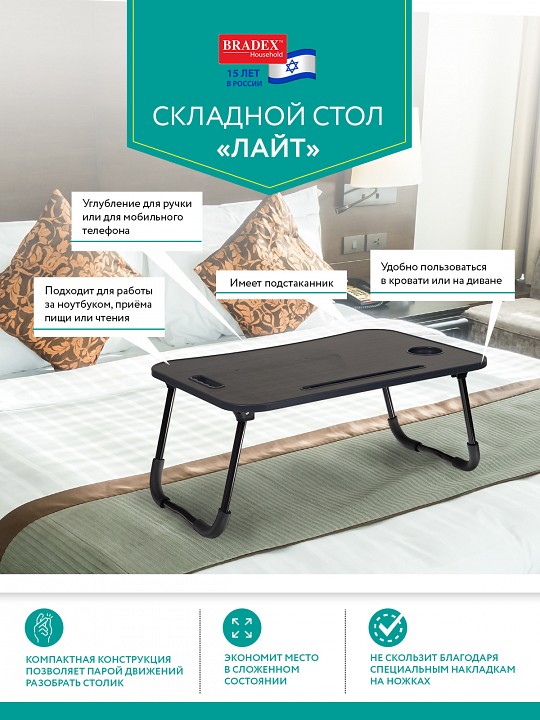Стол имеет встроенный подстаканник и углубления. Столешница сделана из безопасного и экологически чистого материала, устойчива к влаге и царапинам. Антискользящие накладки на ножках стола предотвратят неожиданные падения конструкции.