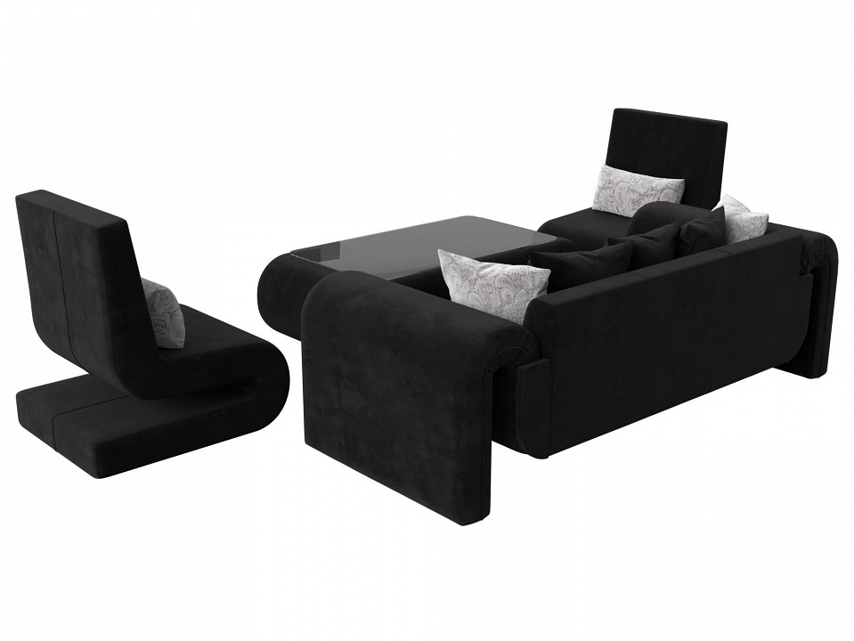 Компоненты, входящие в комплект: диван — 2380х850х780 мм, стол журнальный — 1450х640х540 мм, 2 кресла — 660х770х800 мм