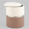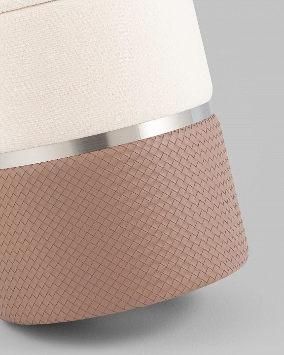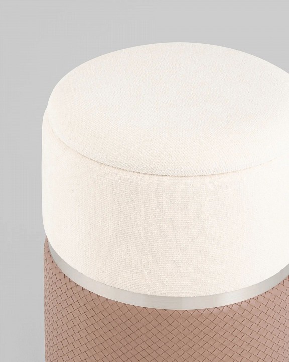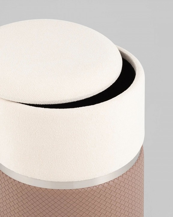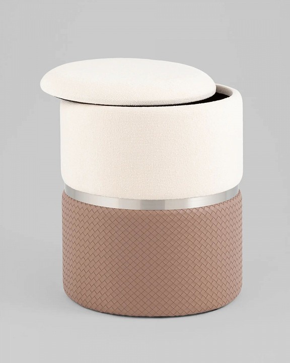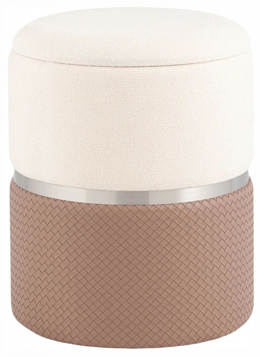 Лаконичная модель пуфа в мягкой обивке и серебристым металлическим ободком прекрасно впишется в современные интерьеры. Под сиденьем имеется ящик для хранения различных мелочей. В основании предусмотрены специальные подпятники, которые делают пуф более устойчивым и предотвращают скольжение.