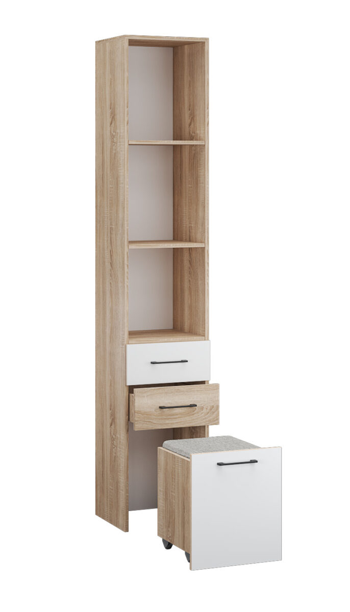 Имеет набор полок за дверцей, 2 ящика и выдвижной пуф.