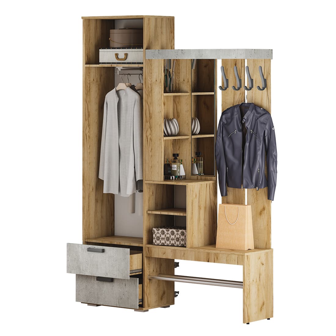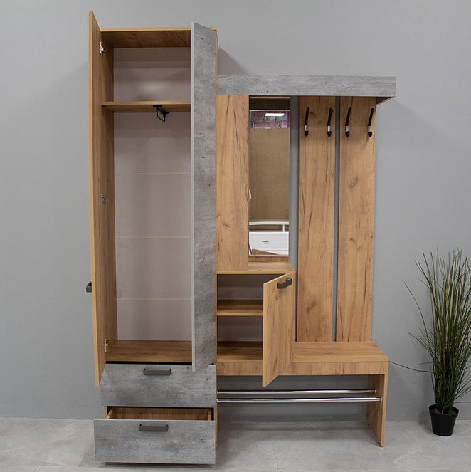Прихожая «Трамп» имеет все необходимые зоны для размещения вещей в прихожей: крючки для верхней одежды, открытые и закрытые ниши, шкаф с выдвижной штангой и зону для хранения обуви.