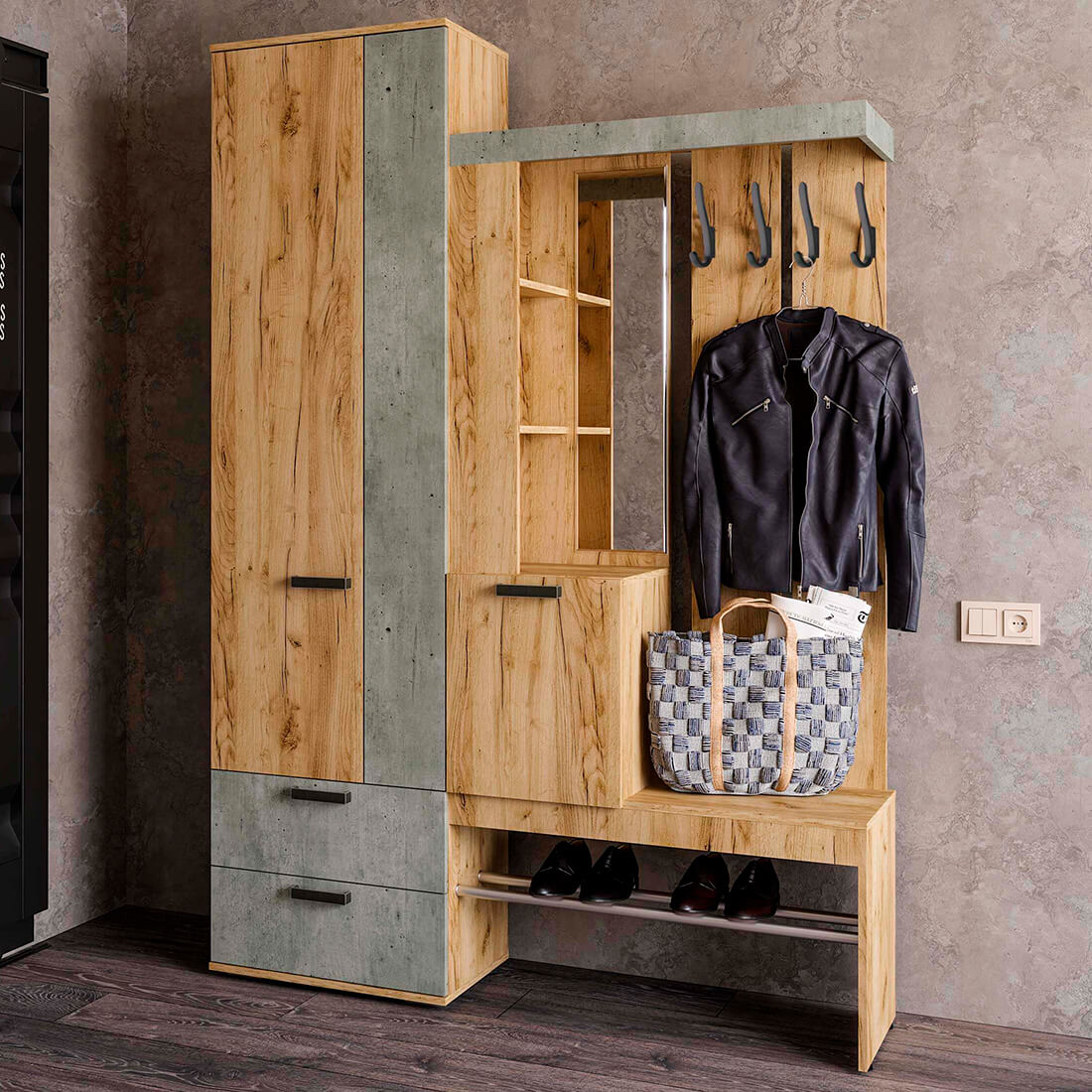 Прихожая «Трамп» вместительна и выполнена в необычном цветовом решении — «Крафт»/ «Бетон».