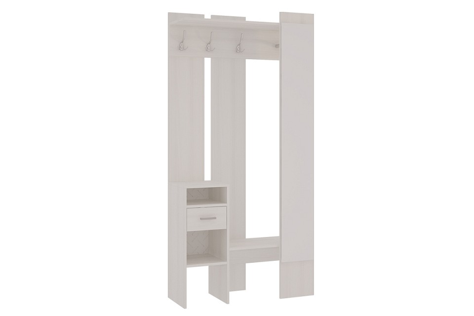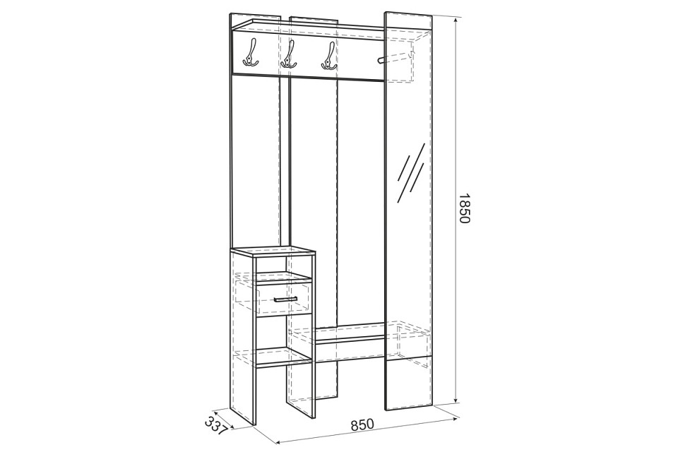 Компоненты, входящие в комплект: зеркало, 1 ящик, 1 штанга для вешалок, 3 крючка, 3 полки