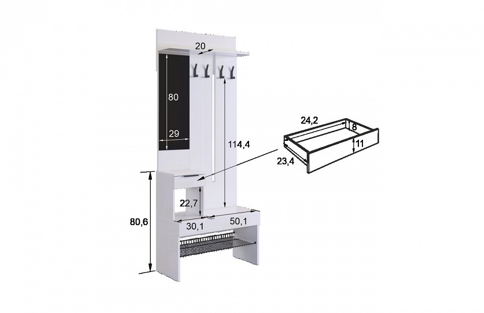 Компоненты, входящие в комплект: зеркало, 1 ящик, 2 полки, 4 крючка