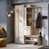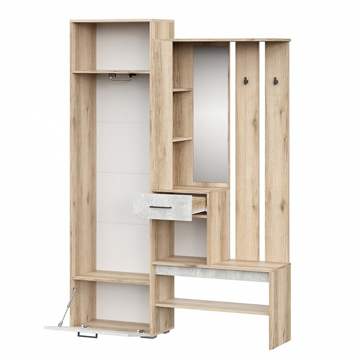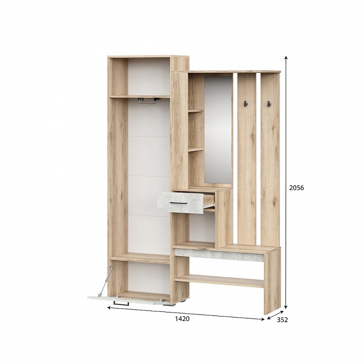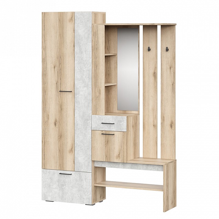 Прихожая Фаворит – готовое решение для обустройства входной зоны. Данная модель подойдет даже в малогабаритную прихожую, она включает в себя: вместительный шкаф с выдвижной штангой, тумбу с выдвижным ящиком и зеркалом, вешалку с крючками для одежды и полки для головных уборов и для обуви. Данная модель выполнена в практичном для прихожей немарком цвете дуб делано / цемент светлый.