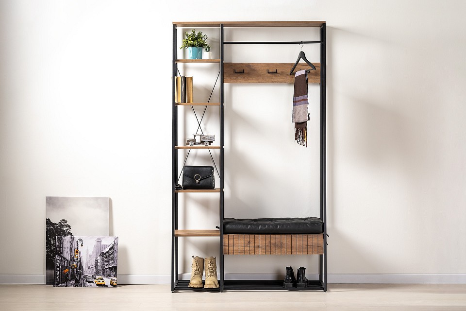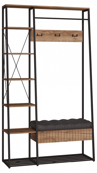 Дополнительное описание: Современная компактная прихожая Гранд в стиле Лофт. Прихожая с открытыми полками, штангой, вешалкой и секцией под обувь с мягким сидением под которым имеется выдвижной ящик. Направляющие оснащены доводчиками. Сборка изделия универсальная на правую и левую стороны.