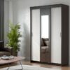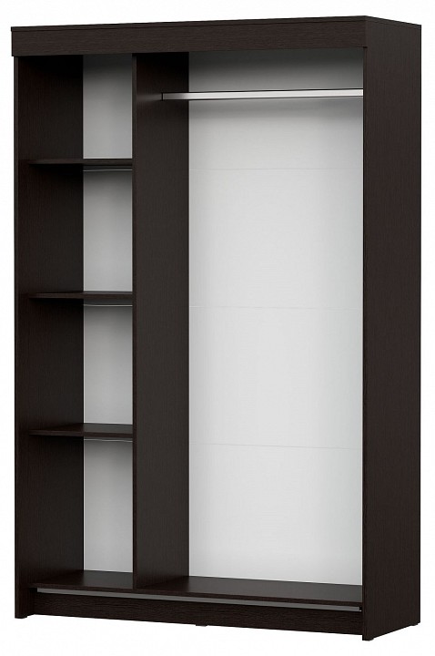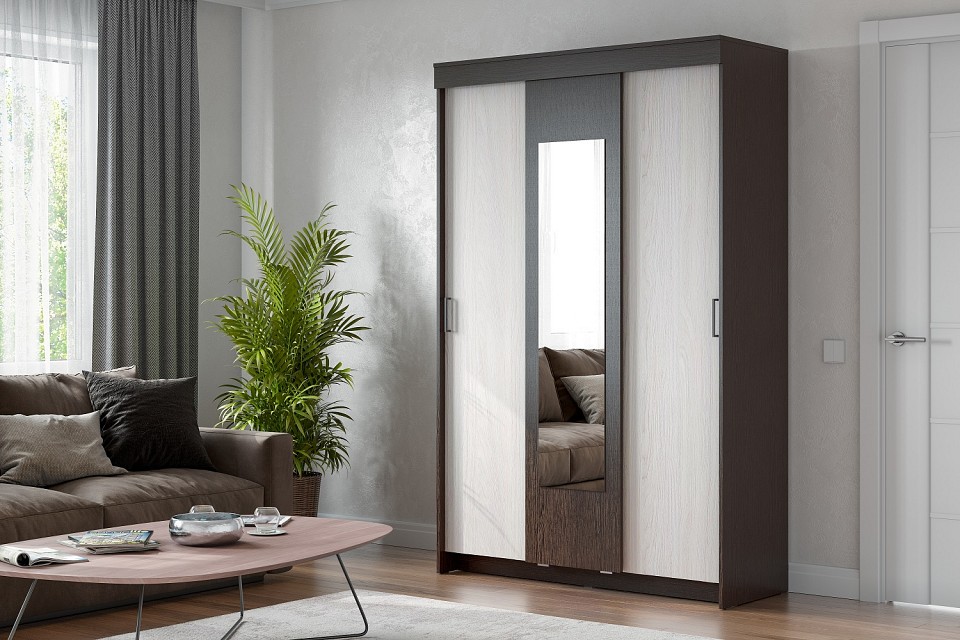 Шкаф-купе в контрастном декоре будет гармонично смотреться в прихожей, гостиной или спальне. В зависимости от расположения, вы организуете грамотное хранение одежды, вещей, аксессуаров и всего того, что необходимо спрятать от лишних глаз. Наполнение шкафа представлено комплектом полок и стационарной штангой. За счет механизма открывания дверей купе вы можете расположить шкаф даже в малогабаритном помещении и сэкономить пространство перед ним. Особенности: контрастный декор, представленный двумя оттенками дерева, зеркальная вставка на фасаде, визуально расширяющая окружающее пространство, тонкие удобные ручки, разноплановое наполнение.