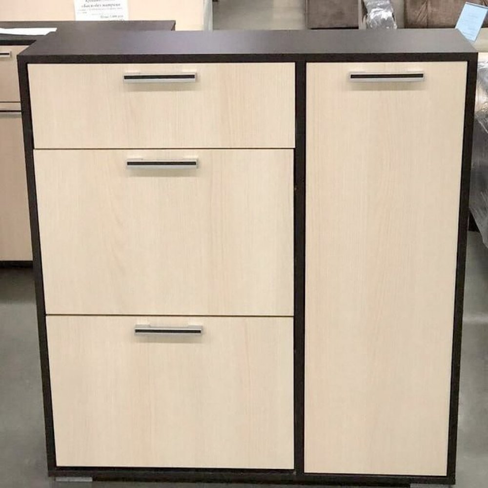 Обувница имеет две секции для обуви, выдвижной ящик и тумбу с распашной дверью.