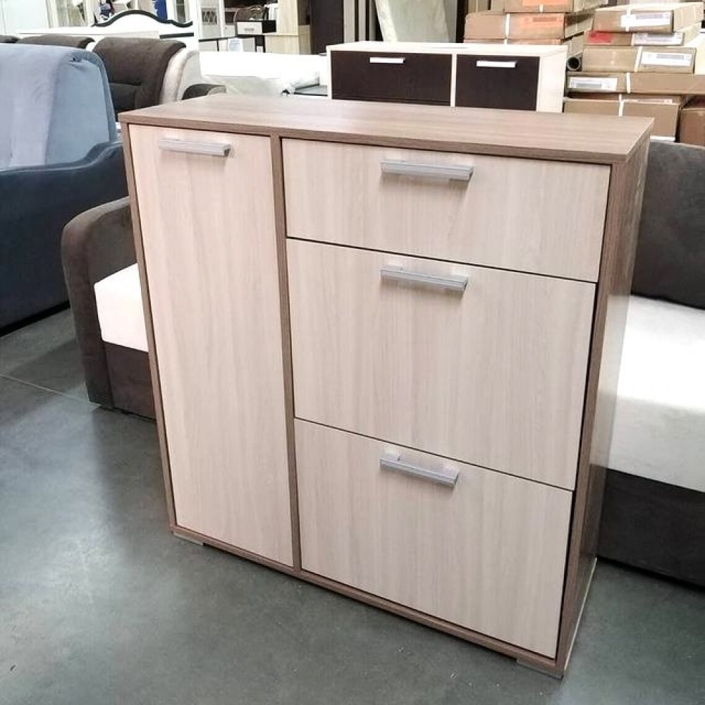 Обувница имеет две секции для обуви, выдвижной ящик и тумбу с распашной дверью.