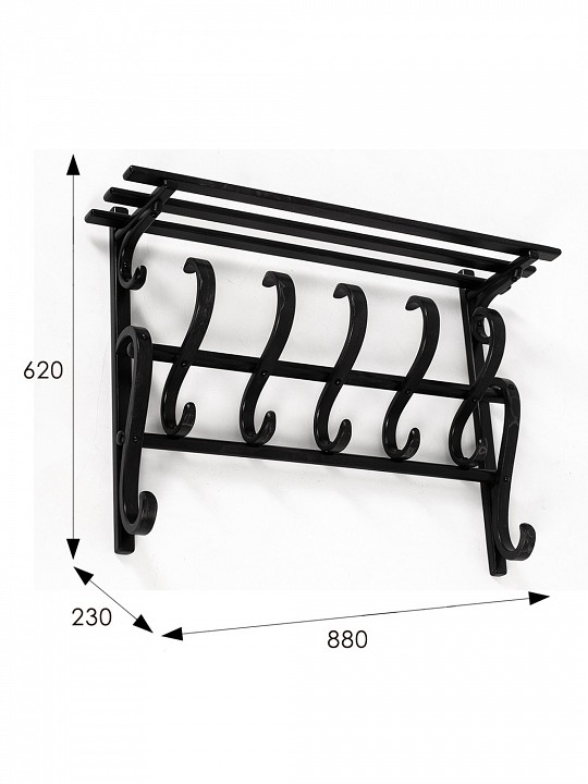Вешалка-полка В7Н — полностью деревянная вешалка. Крючки и декоративные завитки для этой модели изготавливаются вручную, что позволяет придать им более изящные формы. Пять крючков для одежды, столько же для головных уборов, полочка.
