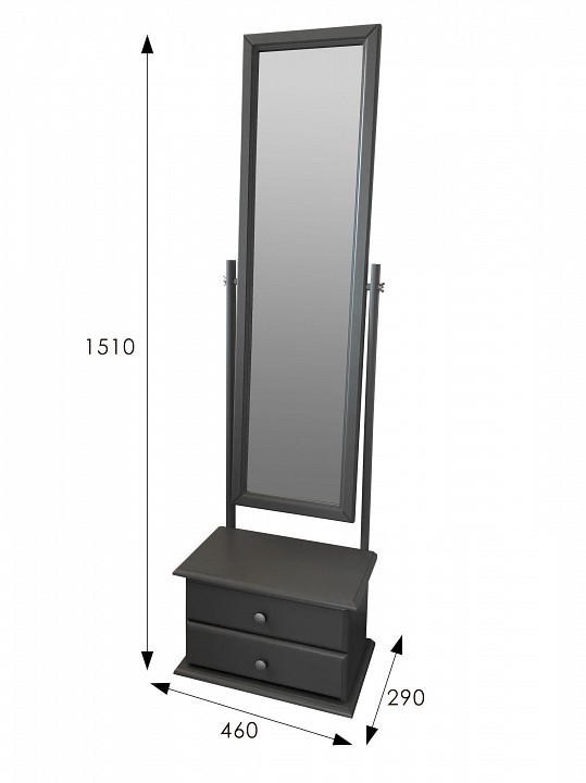 Напольное зеркало с изменяющимся углом наклона зеркального полотна и двумя вместительными выдвижными ящиками для мелочей. Обрамлено крепкой рамой с подложкой, это защищает его от случайных неприятностей.