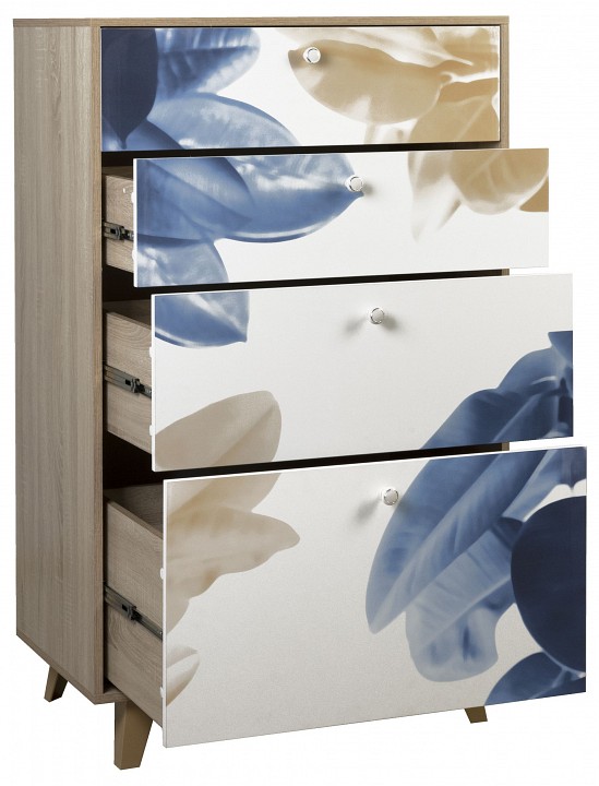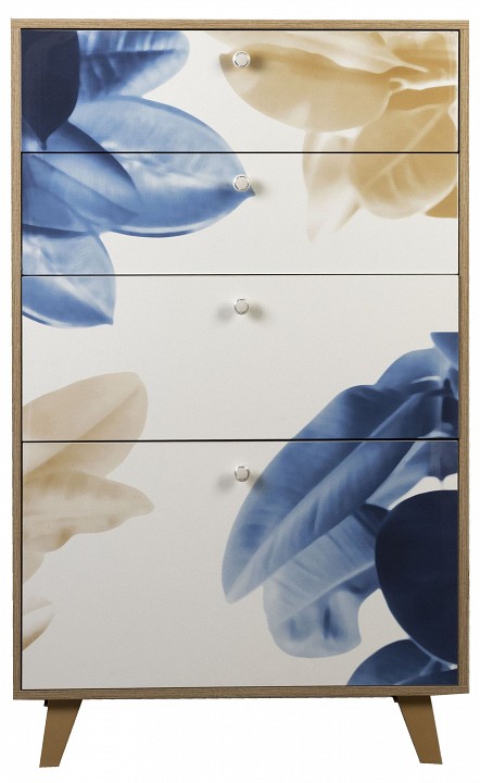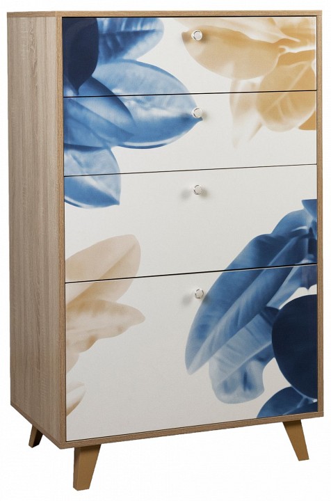 Дополнительное описание: Комод 63.01 ‘Аккорд’ с 4-мя выдвижными ящиками разной глубины и фасадом с цветным принтом. Комод установлен высокие опоры.