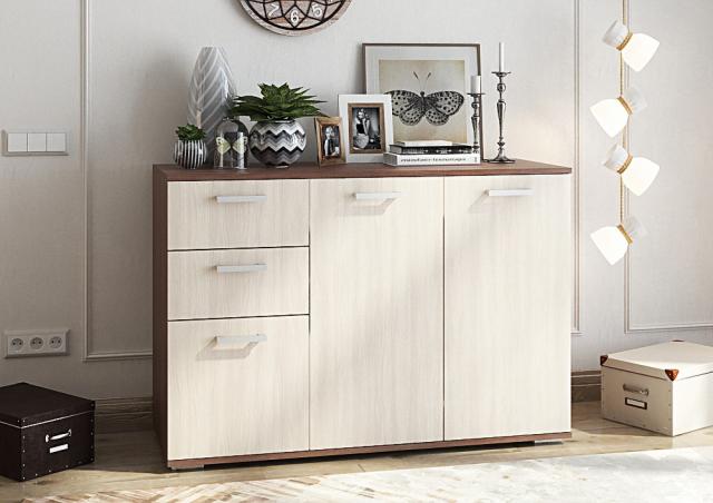 Комод состоит из двух частей, одна из которых состоит их трёх выдвижных ящиков, вторая оборудована закрытыми полками.