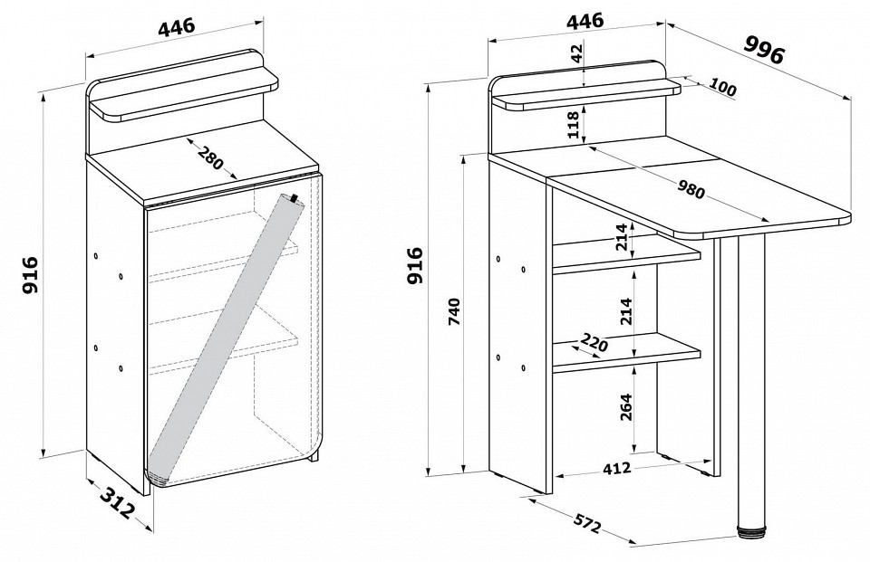 Дополнительные параметры: габариты в сложенном виде — 312x446x916 мм, габариты в разложенном виде — 980x446x916 мм, максимальная нагрузка на столешницу — 20 кг, максимальная нагрузка на полку — 5 кг