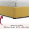 Весь периметр 2 спальной кровати выполнен из мебельной ткани – велюр.Ткань износостойкая, легко чистится от загрязнений. Кровать оборудована ортопедическим основанием — металлическая рамка с гнутоклееными ламелями. Безопасное противоударное скругление в ножной спинке является весьма актуальным и взрослым, и детям. Нагрузка на одно спальное место 125 кг. Рекомендуемый вес матраса — не более 35 кг. Рекомендуемая высота матраса – не более 20 см.